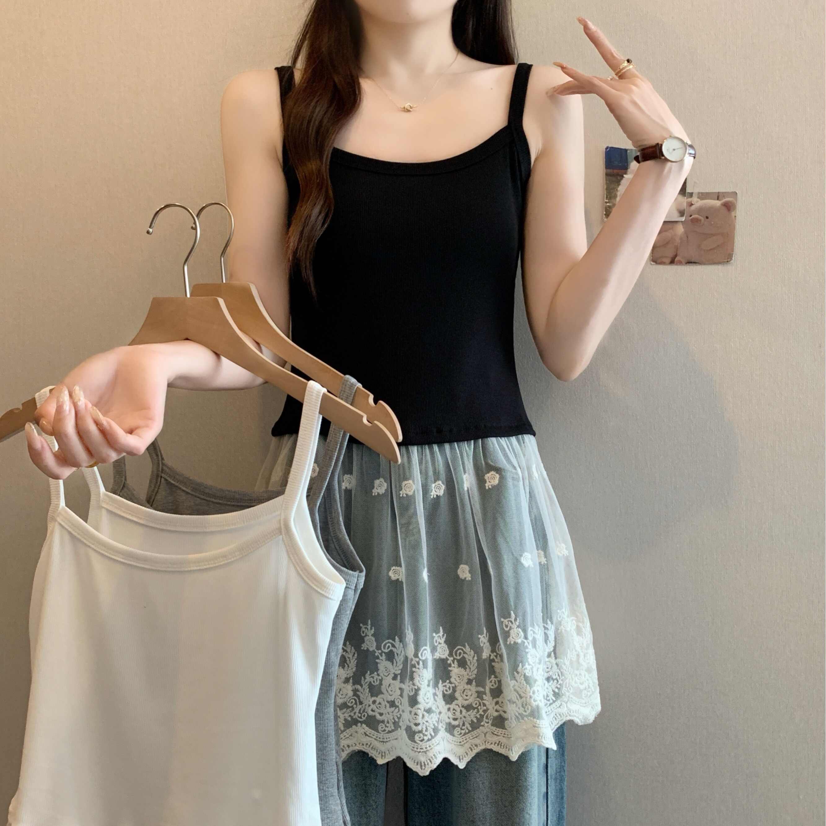 - 2026夏装新款大码女装灰色柔软拼接蕾丝设计感吊带女高级感背心女