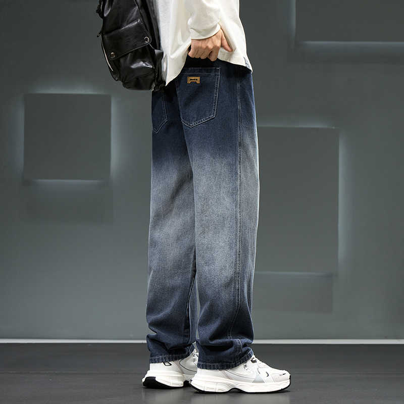 - 2025秋季新款渐变色高街宽松直筒阔腿牛仔裤男松紧腰系绳裤子